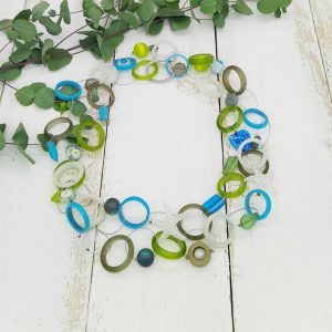 variable Kette aus Glas-/ und Drahtringen in Meerestönen